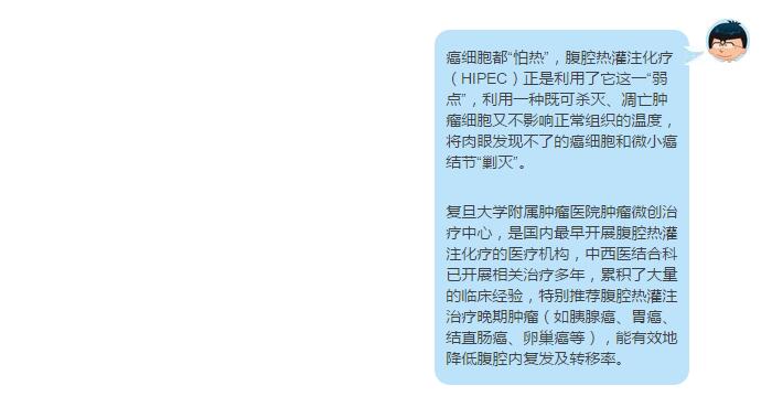 復旦大學附屬腫瘤醫院腫瘤微創治療中心聯合滬上多家三甲醫院普外科,為多名消化道腫瘤術后患者帶來了這一福音。患者在接受腫瘤切除術后,再花1-2個小時舒舒服服的給腹腔洗了個“熱水澡”,徹底剿滅“余匪”,清掃“戰場”,達到事半功倍的效果,受到患者及家屬的一致好評。