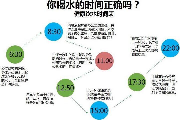 不要在短時間內大量飲水,這樣不僅容易影響消化功能,還能引起反射性排汗亢進,增加心臟和腎臟的負擔。正確飲水方式為:一次性將整杯水(200ml,約為一小包牛奶的規格)緩慢喝完,這樣可以使身體有效的進行吸收利用。年長一些的人去可以將一杯水分為2次(每次100ml)緩慢喝完。